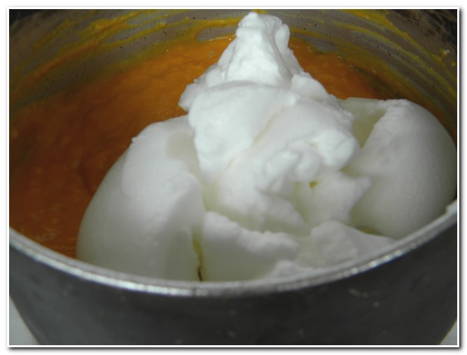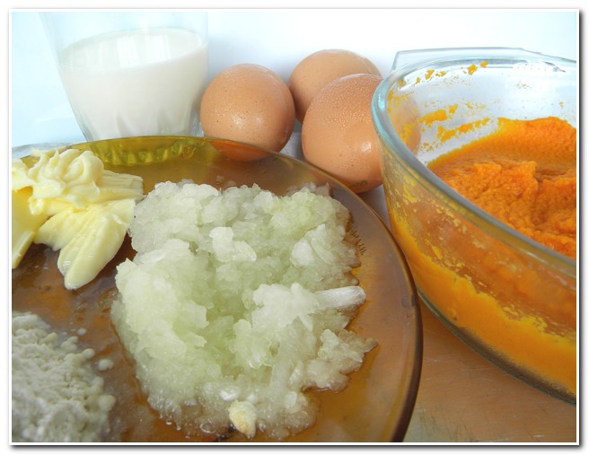 Cozinhe a abóbora com água e sal, depois amasse com um garfo e reserve. Em uma panela coloque a cebola e a manteiga e deixe dourar. Acrescente a farinha de trigo e também deixe dourar um pouco. Vá acrescentando o leite aos poucos e com a ajuda de um fouet (ou outro batedor qualquer) vá misturando até formar um creme. Depois junte a abóbora a este creme. Misture um pouco para esfriar e só então junte as 3 gemas. Bata as claras em neve e misture cuidadosamente ao creme. Coloque em um recipiente untado e enfarinhado. Leve ao forno até dourar. Sirva imediatamente. Se demorar para servi ele abaixa como qualquer suflê.